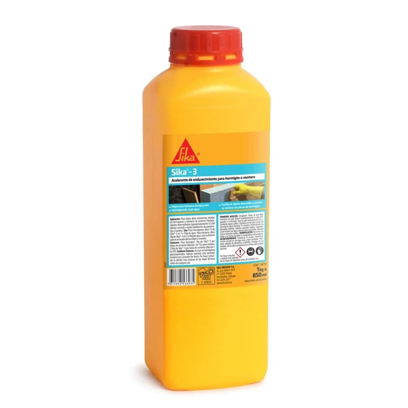 Acelerante de fraguado para hormigón o mortero. Sika®-3 es un aditivo desarrollado especialmente como potente acelerante de fraguado, para hormigón o mortero, sin pérdida de resistencias finales. Dichas características técnicas se verifican en los ensayos comparativos de hormigones, realizados en la Facultad de Ingeniería y Agrimensura -Informe T-Nº 1377 – 03.10.74. Sika®-3 no debe utilizarse en hormigón precomprimido. -Mejora en los tiempos de ejecución -Acelera los tiempos de fraguado y endurecimiento. -Facilita el rápido desmolde y puesta en servicio de piezas de hormigón. Uso: Para lograr altas resistencias iniciales del hormigón. Para hormigonar con bajas temperaturas. Para la rápida habilitación de pavimentos y bacheos. Para el anclaje de máquinas, tacos, y grampas. Para el hormigonado con presencia de agua permanente. Ventajas: Mejora en los tiempos de ejecución Acelera los tiempos de fraguado y endurecimiento. Facilita el rápido desmolde y puesta en servicio de piezas de hormigón. Packaging: Envases de 860 ml (1 kg.); 4,3 l (5 kg.); 17,2 l (20 kg.) y 172 l (200 kg.) Color: Líquido opalescente / Celeste pálido. Base química: Solución de sales minerales. Conservación: 2 años a partir de la fecha de fabricación. Condiciones de almacenamiento: Almacenado en los envases originales bien cerrados, en lugar fresco y seco. Densidad: Aproximadamente 1,16 kg/l. Cada kg de Sika®-3 equivale a 0,86 lt. Ph: ~ 7. Consumo En hormigón: Para una dilución 1:15 en agua: 1,0 kg. por cada bolsa de cemento de 25 kg.