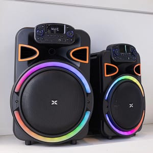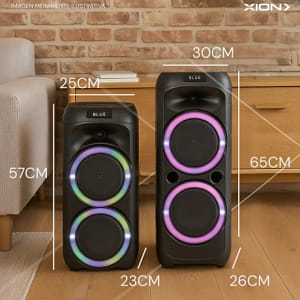 Medidas de cada parlante: 120 cm, 38 cm, 38 cm (alto, ancho, prof)