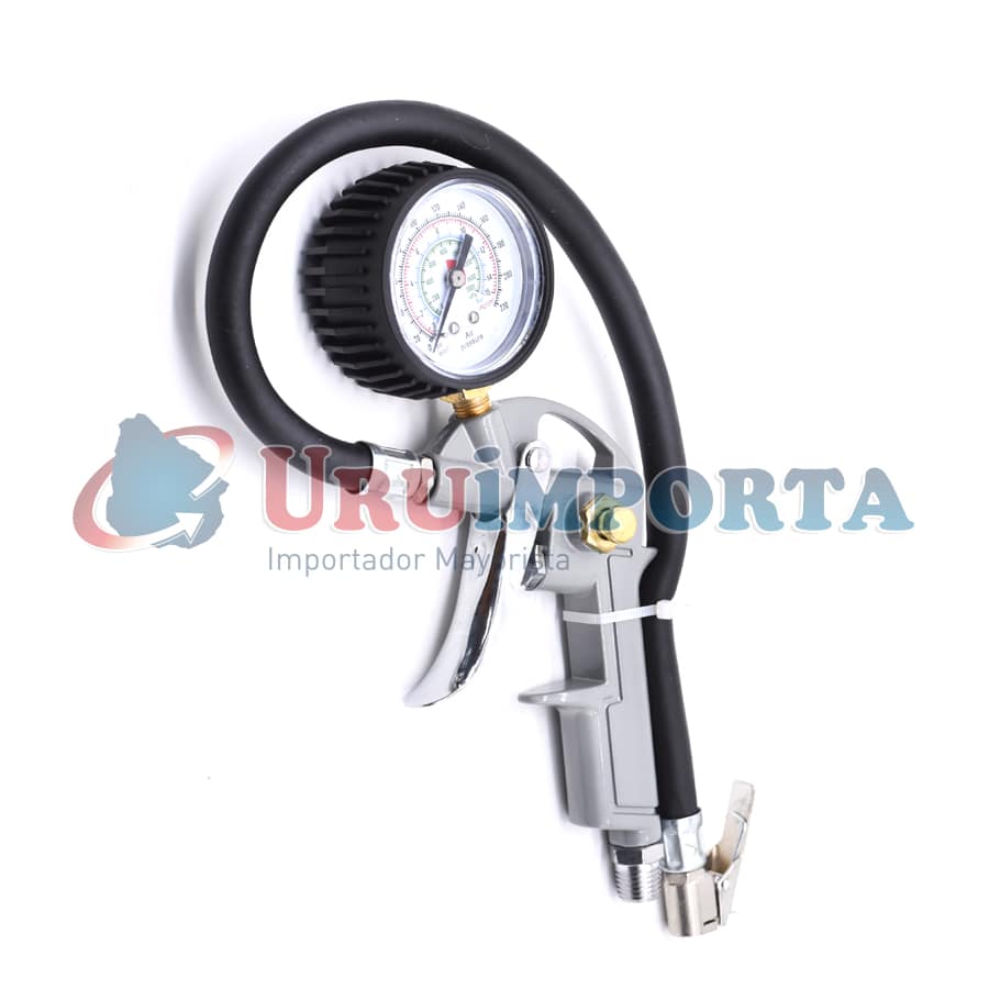 *Inflador con manómetro de 220PSI, 15bar, Kpa1500, reloj recubierto de goma, pico flexible y palanca en puntero para fijar el mismo con la válvula.
