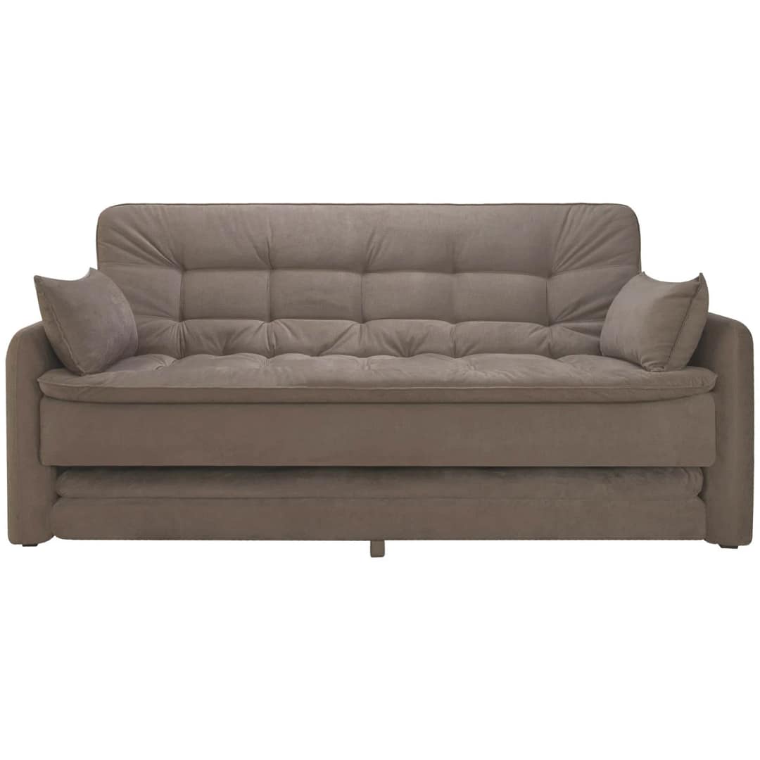Sofá confeccionado 100% en tela poliéster. Apertura manual, con cama marinera de 1 plaza o como extensión del sofá, con patas de metal. Respaldo con 3 posiciones. Relleno espuma densidad 26 kg/m3 y estructura en madera de eucaliptus. Patas de plástico. Medidas cama: 180×115 cm.50cm de altura del piso al asiento. Material de la estructura hecho en madera + chapa de compensado, con espuma D26 + asiento y respaldo de fibra de silicona, espuma D23 en apoyabrazos y cintas elásticas.